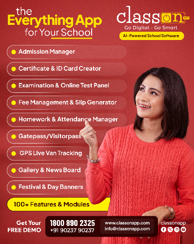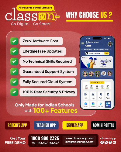 Class ON ERP is India’s most advanced AI-powered school Software designed to simplify school operations and enhance productivity. It is a complete Cloud-Based School ERP Software that connects schools, teachers, parents, and students in one smart platform. With 100+ powerful modules, Class ON helps manage attendance, fees, homework, exams, transportation, certificates, admissions, communication, and more - all in one place. Recognised as the Best School ERP Software in India, Class ON empowers schools to go 100% digital with zero hardware costs, secure cloud data, and a user-friendly interface. Trusted by 1000+ schools across India, it ensures seamless administration, faster communication, and improved academic performance. If you’re looking for a reliable, feature-rich, and easy-to-use School Management Software, Class ON App is the perfect choice to make your institution smarter, digital, and future-ready. 👉 Visit www.classonapp.com